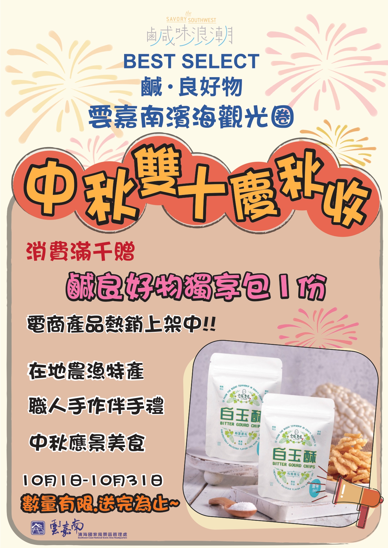 雲嘉南濱海觀光圈,鹹•良好物<中秋雙十慶秋收> 消費滿千贈~白玉苦瓜酥獨享包一包!
